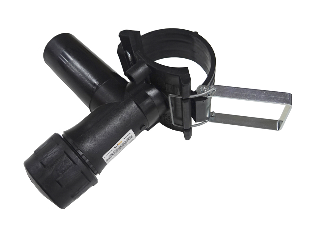 Ответная часть снабжена системой быстрой фиксации фитинга металлическим рычагом, позволяющим осуществлять крепление седлового отвода к трубе до момента сварки без применения дополнительного инструмента.
